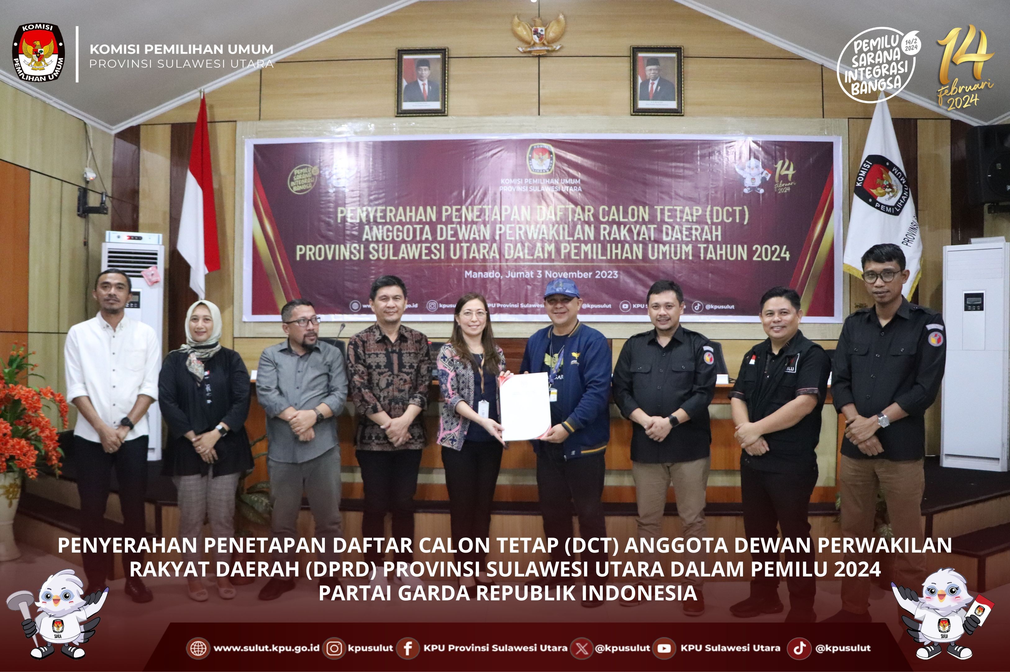 Penyerahan ini diserahkan langsung oleh Ketua dan Anggota KPU Sulut dan diterima oleh Perwakilan dari Partai Garda Republik Indonesia serta disaksikan oleh Bawaslu Sulut.