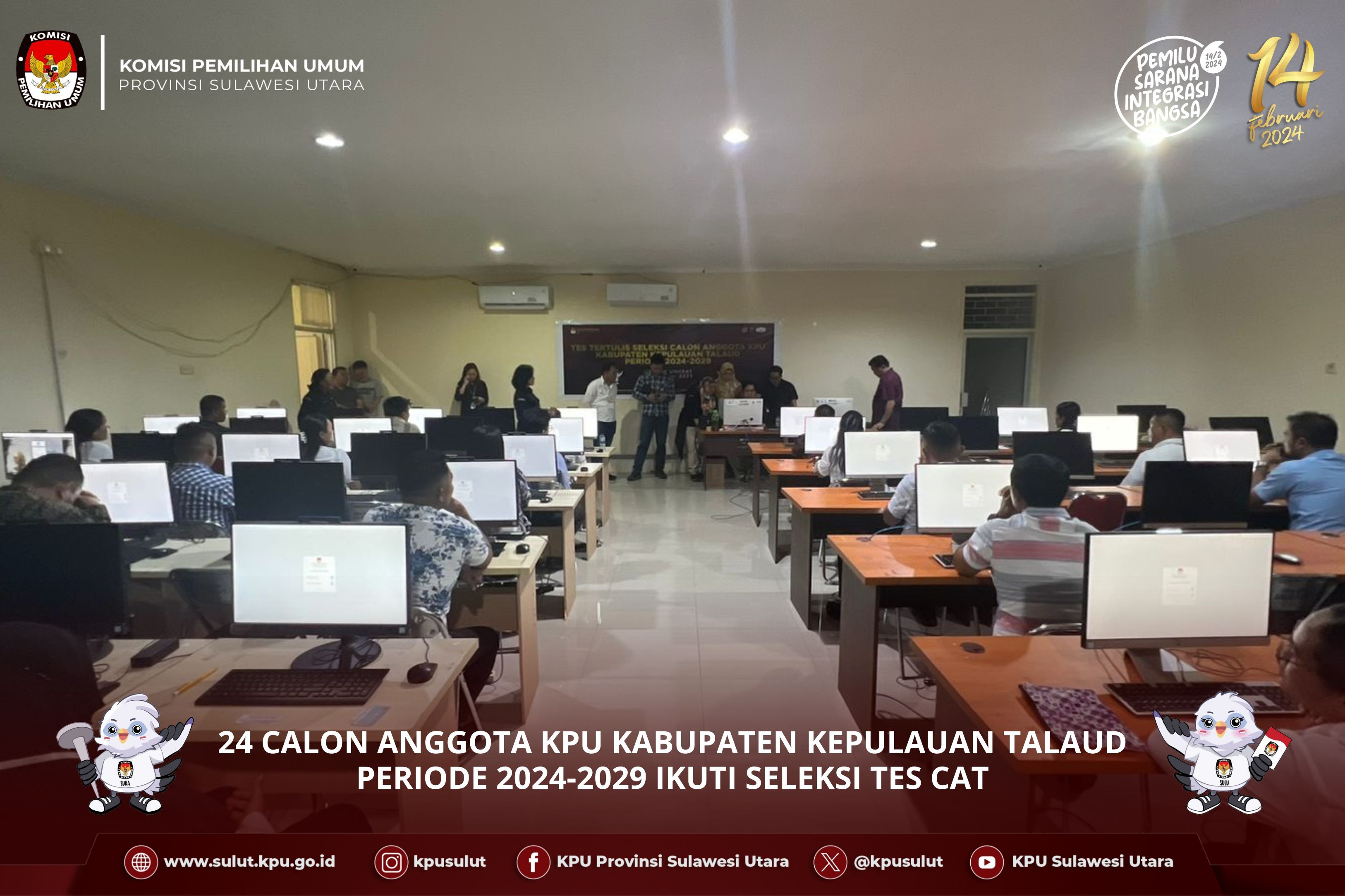 Manado, sulut.kpu.go.id – Sebanyak 24 calon Anggota KPU Kabupaten Kepulauan Talaud mengikuti seleksi tes tertulis dengan sistem Computer Assisted Tes (CAT). Tes ini digelar di Gedung UPT TIK Universitas Sam Ratulangi pada hari minggu (29/10). Ketua Tim Seleksi Victorry N.J. Rotty dalam pembukaannya menyampaikan bahwa tes ini merupakan tes awal dari rangkaian tes-tes yang akan diikuti oleh bapak/Ibu sekalian jadi sekiranya para peserta yang mengikuti seleksi dapat menikmati setiap proses demi proses yang akan dijalani. Rotty juga mengungkapkan walaupun tes tertulis ini terbilang masih proses awal setelah melewati seleksi administrasi tentunya namun tidak semua orang mampu melewati tes ini, banyak juga peserta yang akhirnya gugur karena ketidakmampuannya, untuk itu saya berharap para peserta yang hadir sedari awal harus serius sembari menikmati prosesnya. Perwakilan Biro SDM KPU Juniati Christina yang hadir menyampaikan teknis pelaksanaan ujian serta melakukan proses import soal yang disaksikan oleh Tim Seleksi dan jajaran Sekretariat KPU Sulut. Turut hadir pada kegiatan Pejabat Struktural KPU Sulut diantaranya Kepala Bagian Keuangan Umum dan Logistik Meidy Malonda dan Kepala Bagian Perencanaan Data dan Informasi Winda Tulangow beserta Kasubag Hukum dan SDM Lidya Rantung serta Pelaksana Biro SDM KPU RI dan KPU Sulut.(BB/Foto By Wale Pemilu).
