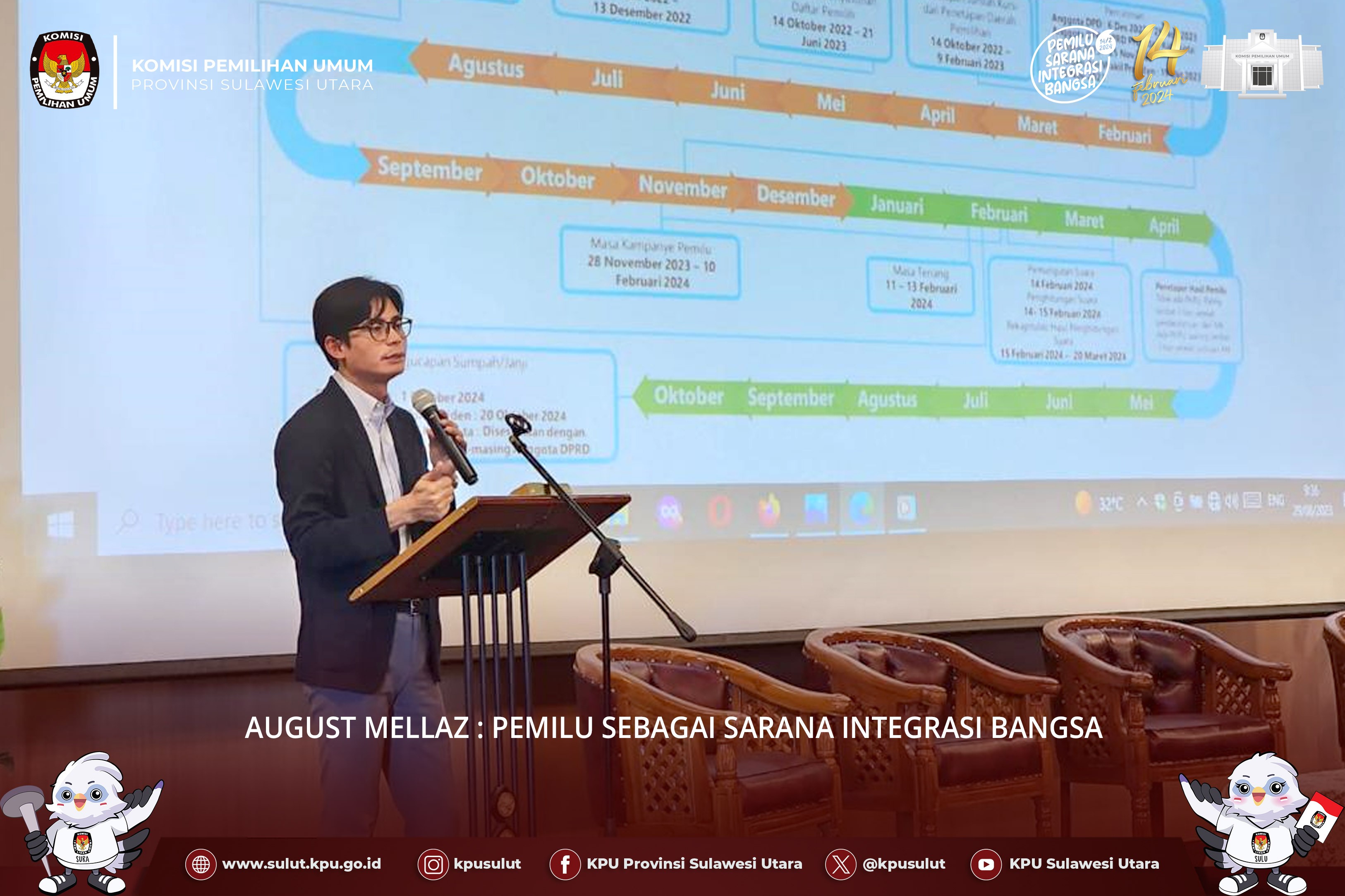 Anggota KPU August Mellaz mengapresiasi kegiatan Deklarasi Pemilu Damai yang dilaksanakan oleh KPU Sulut. Kita semua harus memberikan kontribusi untuk menciptakan Pemilu tahun 2024 yang aman. “Pimpinan Daerah pastilah lebih mengetahui dan memahami dinamika Pemilu di Sulut, kami sebagai pimpinan KPU akan memastikan bahwa apa yang dilakukan oleh KPU Sulut selaras dengan KPU,” ungkap Mellaz.