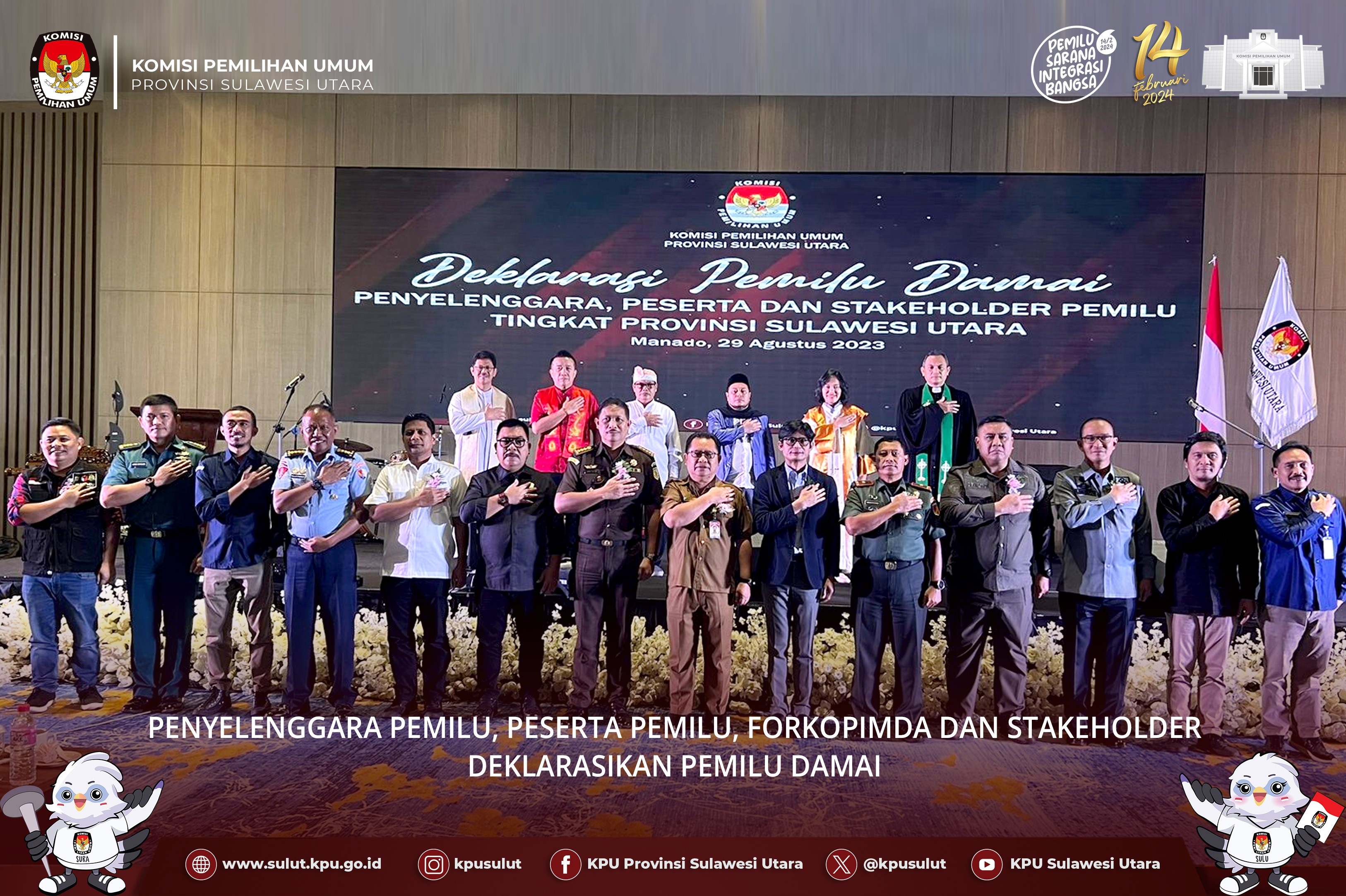 Kegiatan tersebut dibuka Ketua KPU Sulut Kenly M. Poluan. Dalam kesempatan itu, Poluan mengapresiasi dan berterima kasih atas kehadiran Peserta Pemilu, Bawaslu, Forkopimda dan Stakeholder yang ikut serta pada Deklarasi Pemilu Damai.