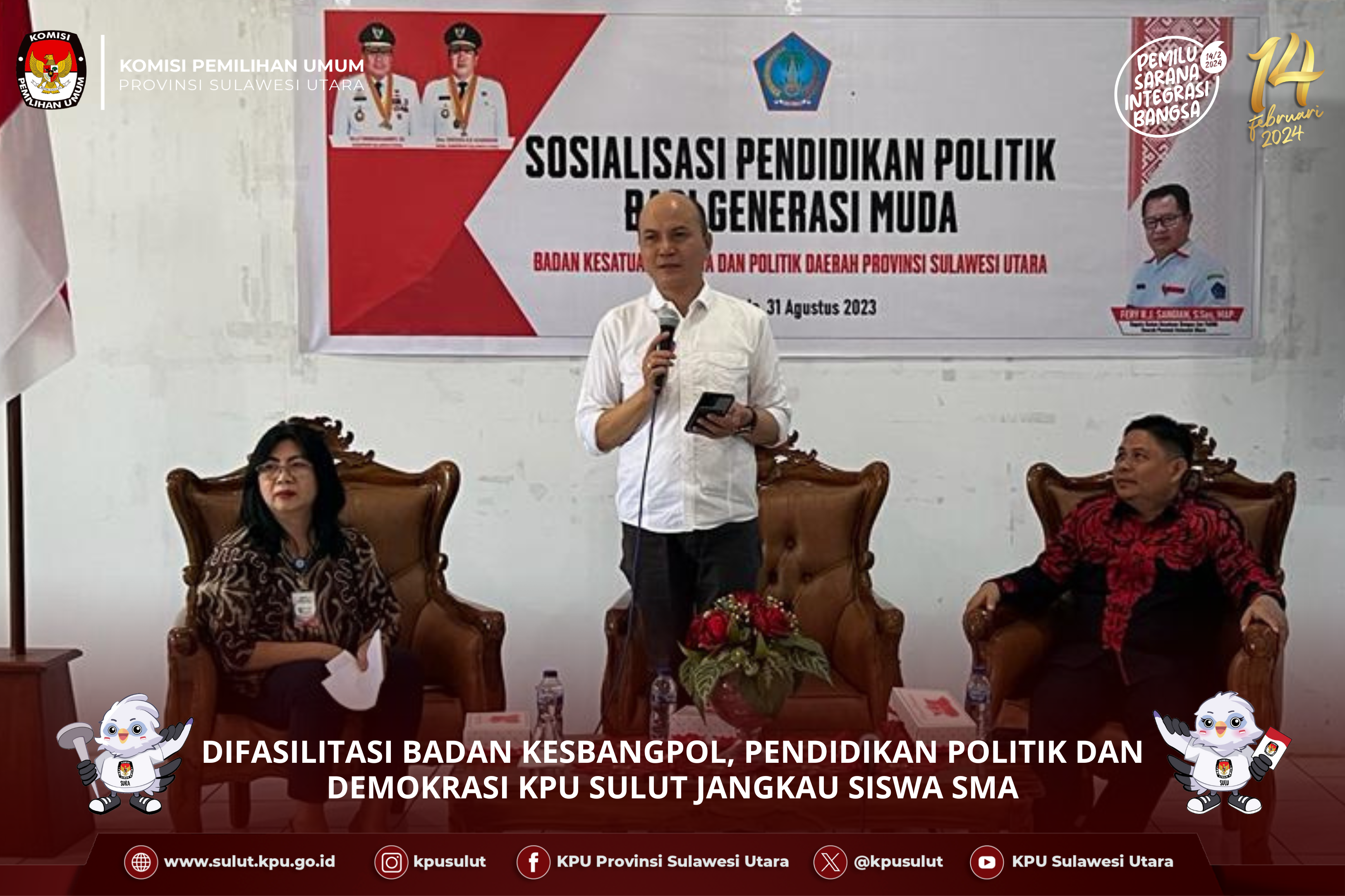 Kepala Badan Kesatuan Bangsa dan Politik Sulut Ferry Sangian yang mewakili Gubernur Sulut, membacakan sambutan Gubernur. Dalam sambutan, Gubernur mengajak semua elemen mewujudkan pemilu yang aman, damai dan berintegritas. Sebagai garda kedepan dalam memastikan proses pemilu berjalan dengan baik, pemerintah berkomitmen memberikan dukungan penuh kepada lembaga penyelenggara yaitu KPU dan Bawaslu serta Forkopimda yang akan mengawal dan mensukseskan Pemilu 2024. Pemerintah juga akan mengajak masyarakat yang wajib pilih untuk menggunakan hak suaranya guna meningkatkan partisipasi pemilu menjadi 95 %.