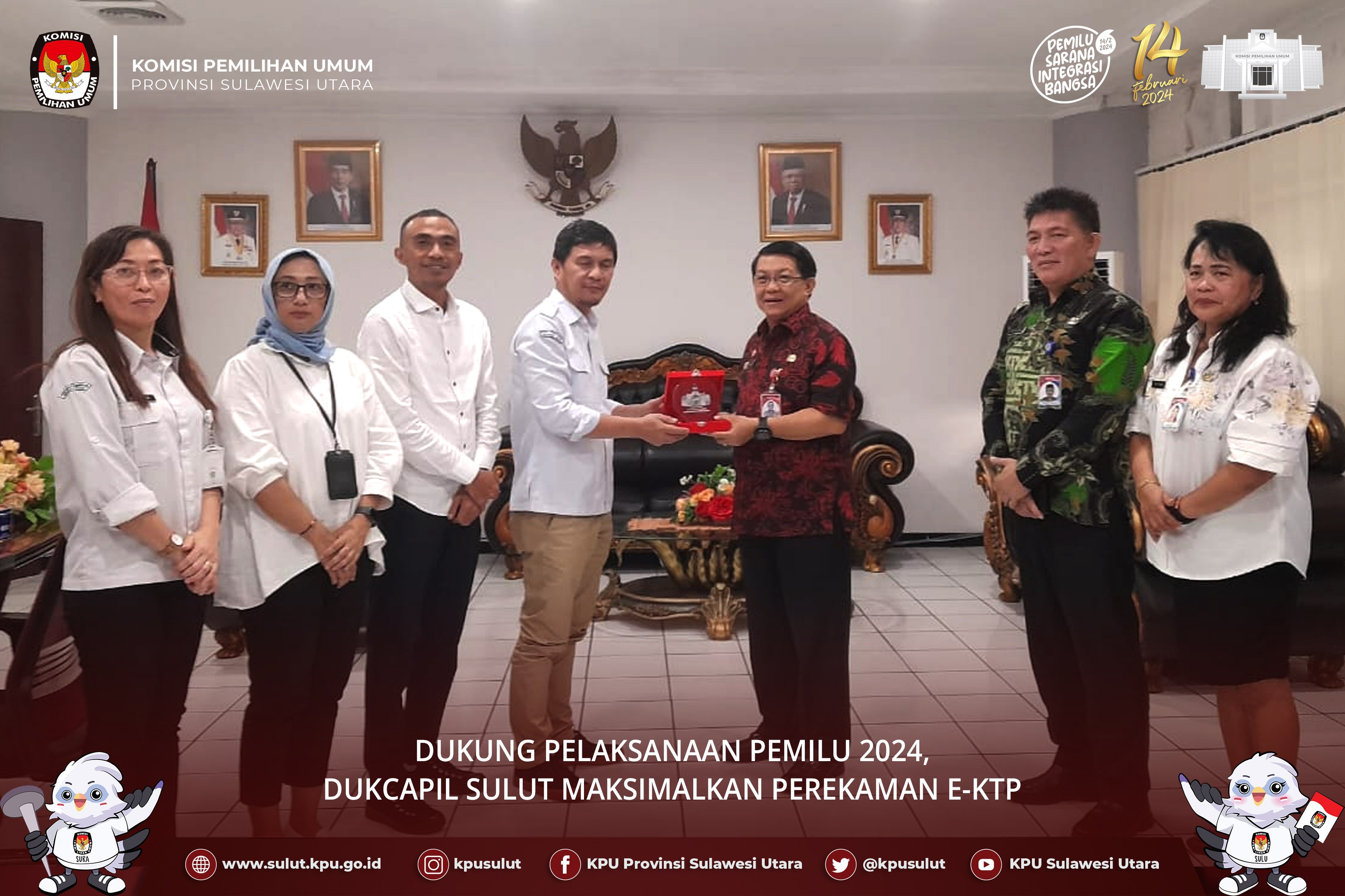 Manado – sulut.kpu.go.id KPU Sulut melanjutkan kunjungan kerjanya ke Stakeholder, kali ini melakukan audiensi dengan Dinas kependudukan, Pencatatan Sipil dan Keluarga Berencana Provinsi Sulawesi Utara. Diterima langsung oleh Assisten 1 Bidang Pemerintahan sekaligus Plt. Kadis Dukcapil dan Keluarga Berencana Provinsi Sulawesi Utara Denny Mangala didampingi Sekretaris Wendy Karwur, dan Kepala Bidang Jeane Wowor. Ketua KPU Sulut Kenly Poluan menyampaikan maksud kunjungan, mengenai permasalahan Data pemilih, dimana masih ada Pemilih yang sudah terdaftar tetapi belum memiliki E - KTP. “Pada dasarnya Pemprov Sulut melalui Dinas Dukcapil Sulut sangat mendukung pelaksanaan Pemilu tahun 2024. Kami telah menargetkan perekaman bahkan kepemilikan E-KTP sebesar 94% sesuai target Nasional per 31 Desember 2023. Semoga sebelum tanggal hari pemungutan suara 14 Februari 2024 bisa mencapai 99% persen”, kata Mangala. Di sisi lain, Anggota KPU Sulut Awaluddin Umbola, mengatakan pemilih pemula merupakan salah satu target dalam upaya peningkatan partisipasi masyarakat. Untuk itu kami berharap percepatan proses perekaman E-KTP bagi Pemilih Pemula sehingga dapat menggunakan hak pilih pada hari H nantinya. Turut hadir dalam audiens, Anggota KPU Sulut dan Data, Kabag Perencanan, Data dan Informasi Lanny Ointu dan Sekretariat KPU Sulut Winda Tulangouw. (Ucu/ed : NRK Foto by wale pemilu)
