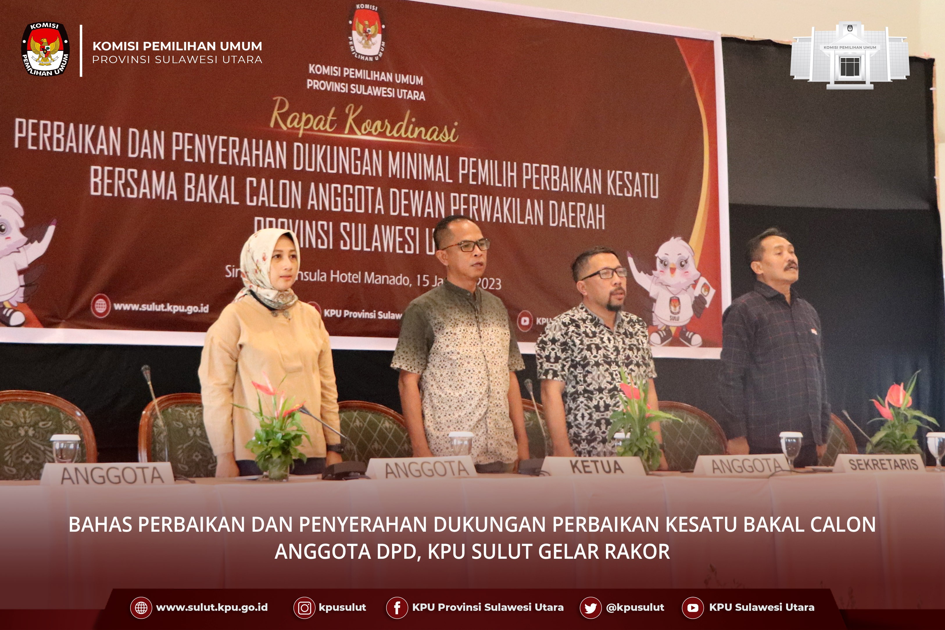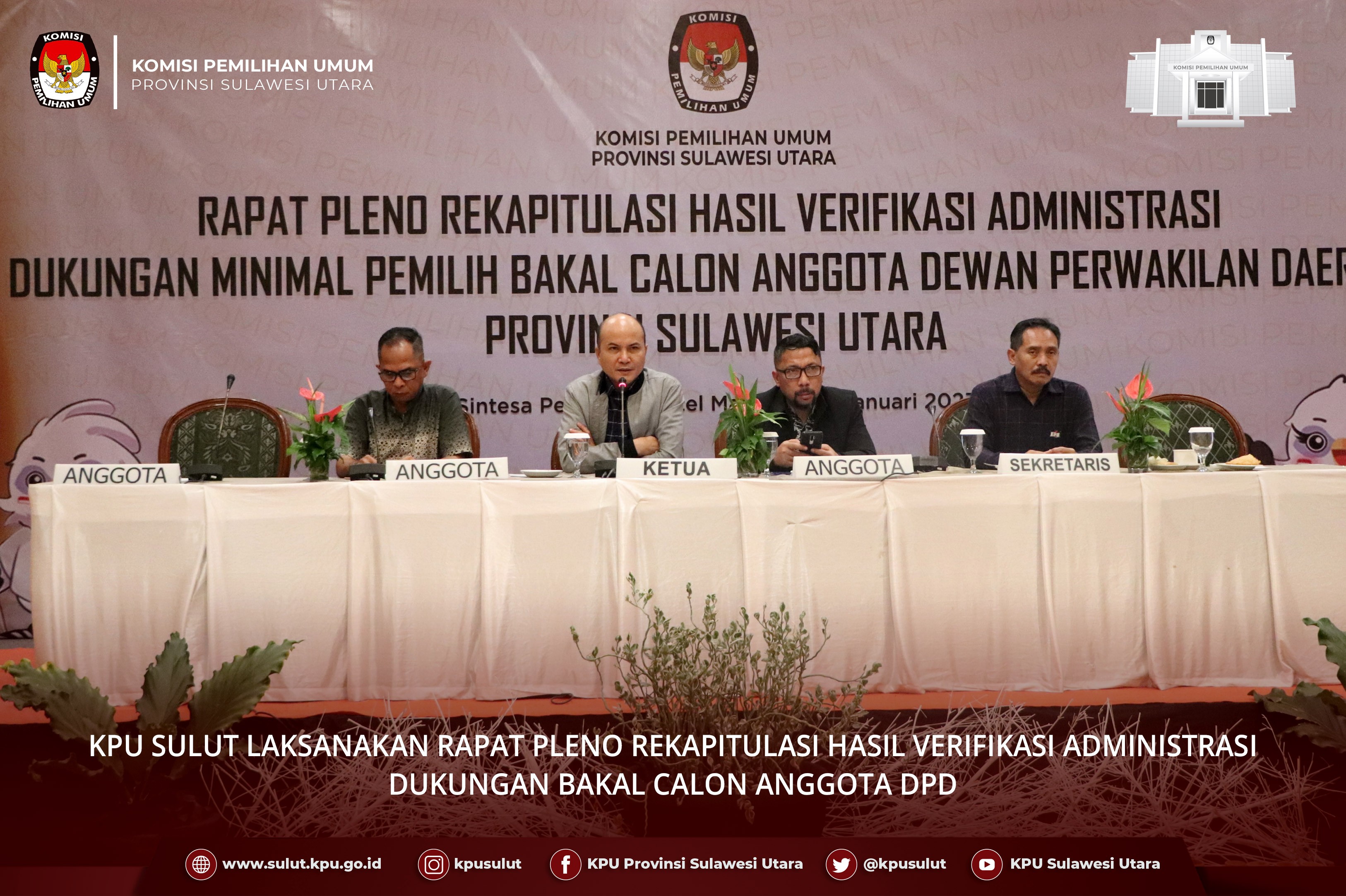 Manado, sulut.kpu.go.id - KPU Sulut menggelar Rapat Pleno Rekapitulasi Hasil Verifikasi Administrasi Dukungan Minimal Pemilih Bakal Calon Anggota Dewan Perwakilan Daerah (DPD) Provinsi Sulawesi Utara, pada hari Minggu, 15 Januari 2023 di Hotel Peninsula Manado. Rapat Pleno dibuka secara resmi oleh Ketua KPU Sulut Meidy Tinangon didampingi Anggota KPU Salman Saelangi dan Amrain Razak. Dalam sambutannya Tinangon menyampaikan KPU Sulut melalui KPU Kabupaten/Kota telah bekerja sesuai aturan dalam melaksanakan verifikasi administrasi. Sekiranya ada perbaikan kedepan tentunya harus mengacu pada aturan dan kami berharap bakal calon bisa memanfaatkan waktu sesuai tahapan yang telah ditetapkan. Ketua Divisi Teknis Penyelenggaraan Salman Saelangi membacakan Hasil Verifikasi Administrasi Dukungan Minimal Pemilih setiap Bakal Calon Anggota DPD. Pada kesempatan itu, Saelangi mengingatkan waktu tahapan perbaikan dan penyerahan dukungan minimal pemilih perbaikan kesatu dimulai tanggal 16 Januari s/d 22 Januari 2023 dan perbaikan dukungan minimal Pemilih dan/atau sebaran oleh Bakal Calon Anggota DPD dilakukan melalui Sistem Informasi Pencalonan (SILON). Hadir dalam rapat pleno ini Ketua Bawaslu Sulut Ardiles Mewoh didampingi Anggota Bawaslu Sulut Supriyadi Pangelu beserta jajaran Sekretariat Bawaslu Sulut dan Petugas Penghubung Bakal Calon Anggota DPD. (Ucu/Ed:Ge/Foto:WalePemilu)