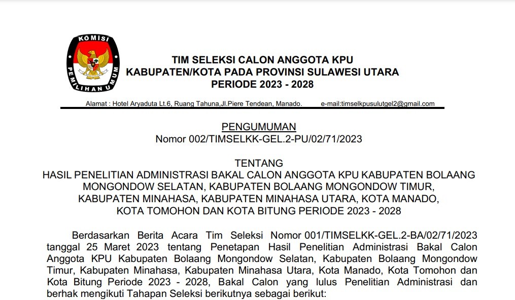 Berdasarkan Berita Acara Tim Seleksi Nomor 08/TIMSELKK-GEL.2-BA/03/71/2023 tanggal 7 April 2023 tentang Penetapan Hasil Seleksi Tertulis dan Tes Psikologi Bakal Calon Anggota Kabupaten Bolaang Mongondow Selatan, Kabupaten Bolaang Mongondow Timur, Kabupaten Minahasa, Kabupaten Minahasa Utara, Kota Manado, Kota Tomohon dan Kota Bitung Periode 2023 - 2028. Bakal Calon yang lulus Seleksi Administrasi dan Tes Psikologi,dan berhak mengikuti Tahapan Seleksi....