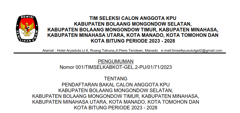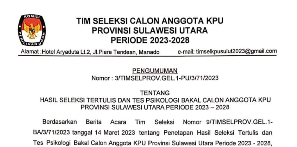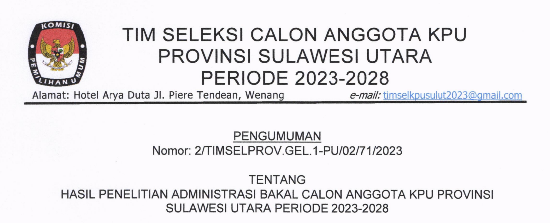Berdasarkan hasil seleksi berkas pendaftaran yang masuk dalam rangka Seleksi Tenaga Administrasi, Satuan Pengamanan (Jagat Saksana), Pengemudi, Dan Pramubakti, diumumkan bahwa peserta sesuai lampiran dinyatakan Lulus Seleksi Administrasi dan selanjutnya dapat mengikuti tes Wawancara.