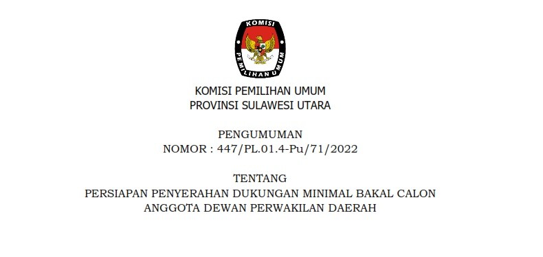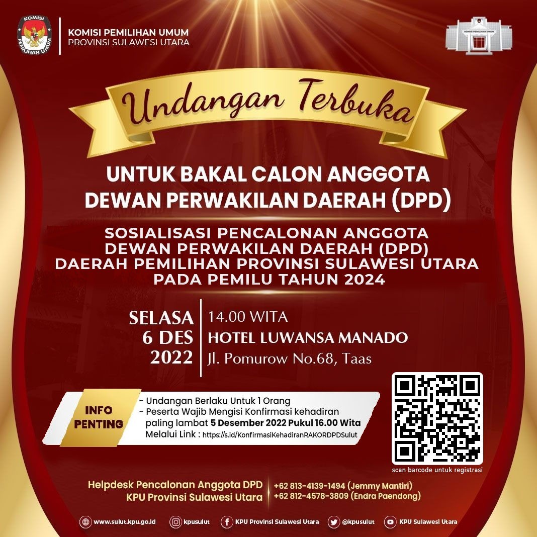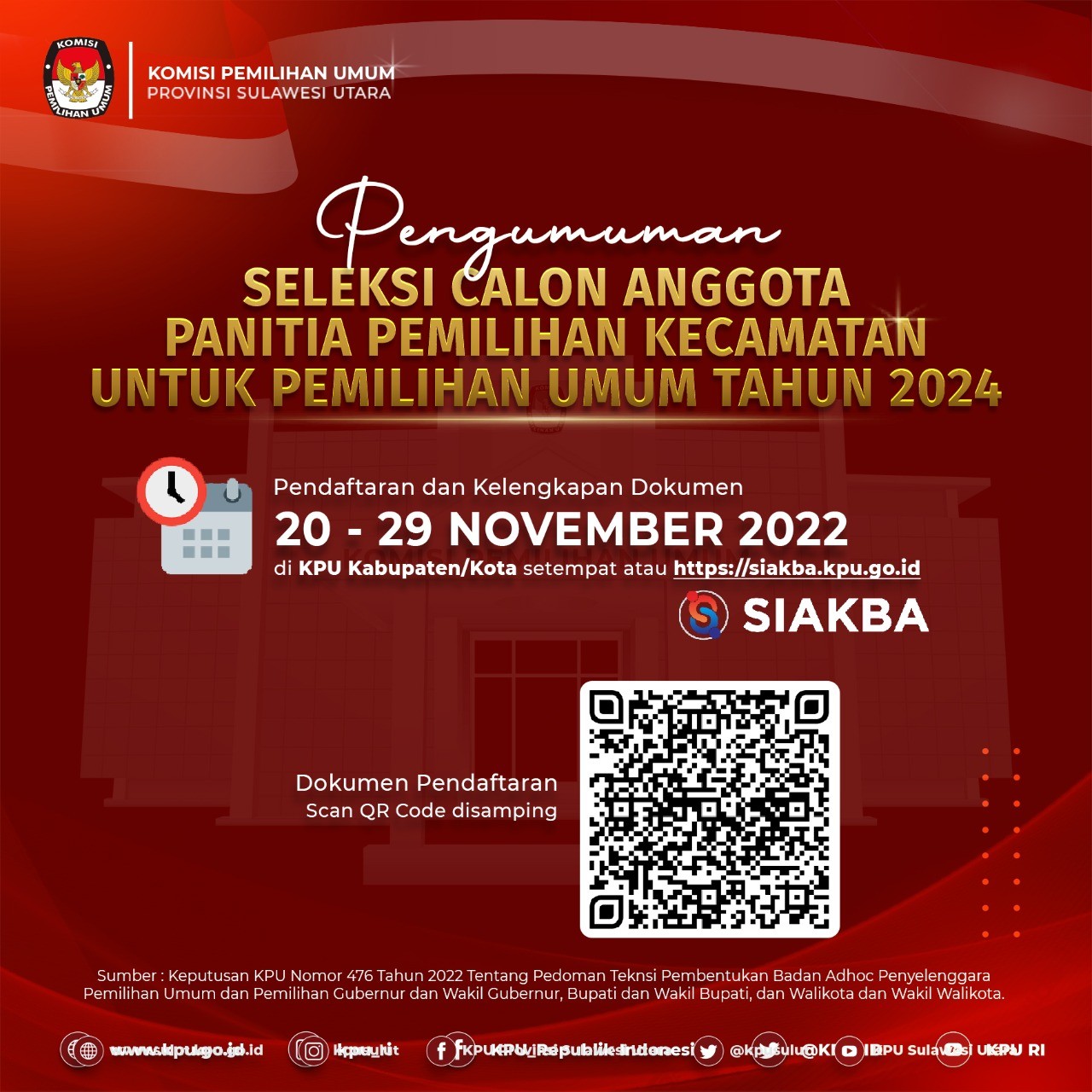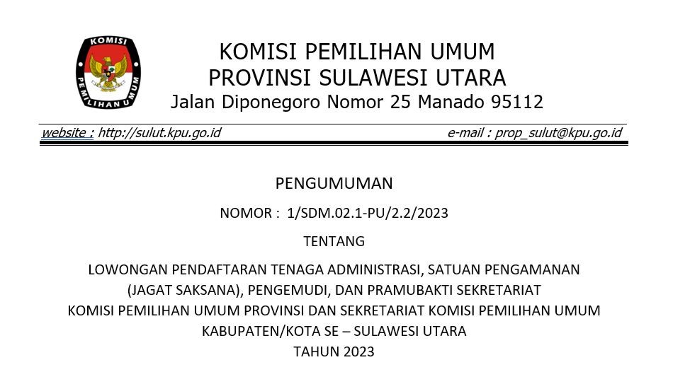 Sekretaris Komisi Pemilihan Umum Provinsi Sulawesi Utara memberi kesempatan kepada putra-putri terbaik bangsa untuk menjadi Tenaga Administrasi, Satuan Pengamanan (Jagat Saksana), Pengemudi, dan Pramubakti pada Sekretariat KPU Provinsi Sulawesi Utara Tahun Anggaran 2023, dengan ketentuan sebagai berikut :