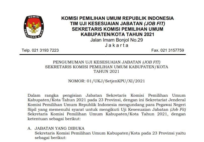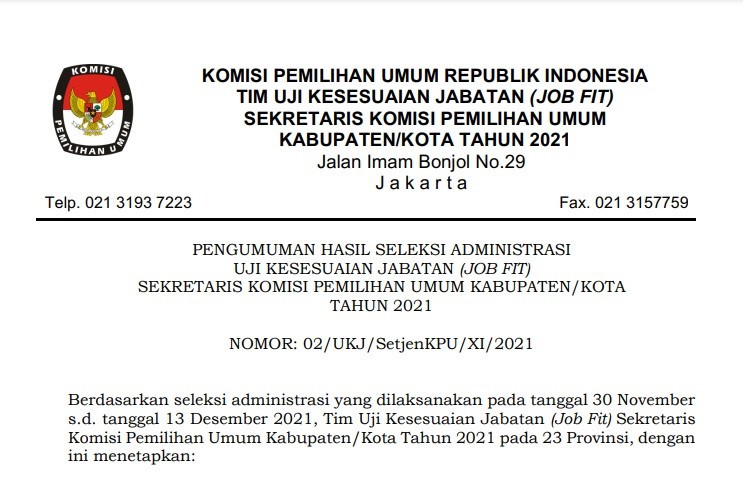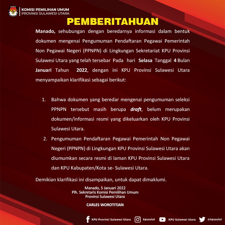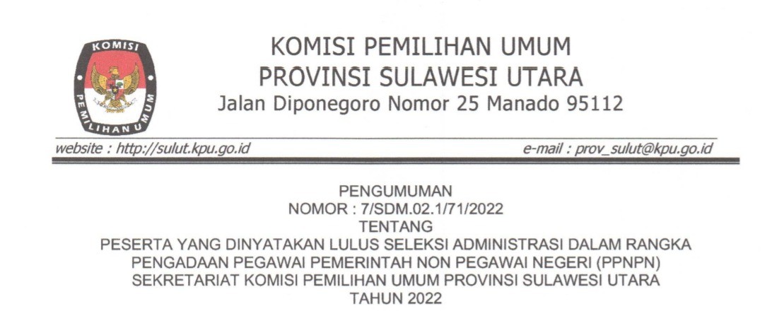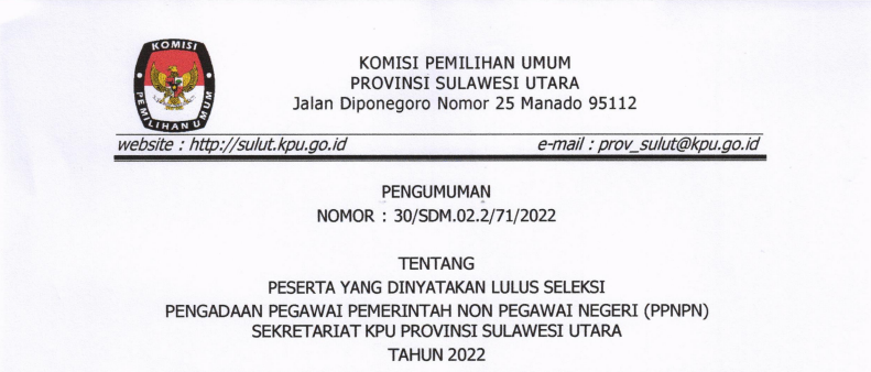 #TemanPemilih Sekretariat KPU Provinsi Sulawesi Utara dan KPU Kabupaten/Kota Se-Sulawesi Utara mengumumkan hasil seleksi Administrasi Pegawai Pemerintah Non Pegawai Negeri (PPNPN). Informasi selengkapnya bisa di download dibawah ini : Pengumuman Hasil Seleksi Administrasi PPNPN KPU Prov. Sulawesi Utara klik disini Pengumuman Hasil Seleksi Administrasi PPNPN KPU Kab. Bolaang Mongondow Selatan klik disini Pengumuman Hasil Seleksi Administrasi Pendaftaran PPNPN KPU Kab. Bolaang Mongondow Timur klik disini Pengumuman Hasil Seleksi Administrasi Pendaftaran PPNPN KPU Kab. Bolaang Mongondow Utara klik disini Pengumuman Hasil Seleksi Administrasi Pendaftaran PPNPN KPU Kab. Bolaang Mongondow klik disini Pengumuman Hasil Seleksi Administrasi PPNPN KPU Kab. Kepulauan Siau Tagulandang Biaro klik disini Pengumuman Hasil Seleksi Administrasi PPNPN KPU Kab. Minahasa Selatan klik disini Pengumuman Hasil Seleksi Administrasi PPNPN KPU Kab. Minahasa Tenggara klik disini Pengumuman Hasil Seleksi Administrasi PPNPN KPU Kab. Minahasa klik disini