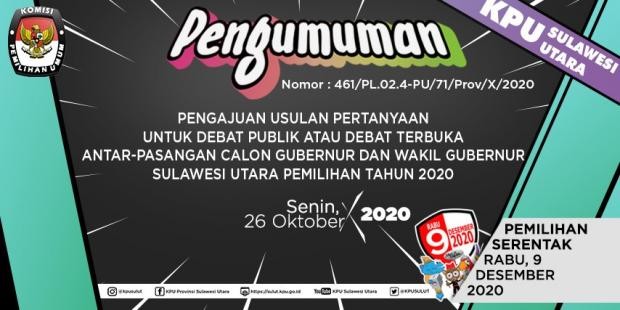 Komisi Pemilihan Umum Provinsi Sulawesi Utara dengan ini memberikan kesempatan yang seluas-luasnya bagi masyarakat Sulawesi Utara untuk mengajukan usulan pertanyaan dalam debat publik atau debat terbuka antar-pasangan calon Gubernur Dan Wakil Gubernur Sulawesi Utara Pemilihan Tahun 2020 untuk dijadikan bahan referensi Tim Penyusun Materi Debat