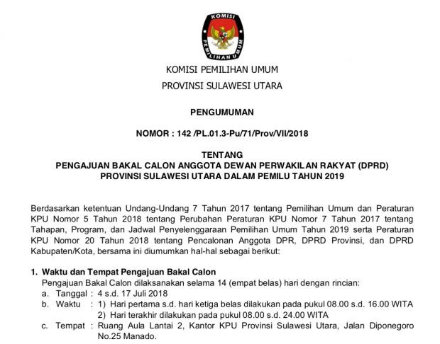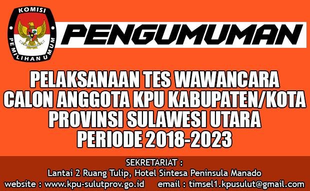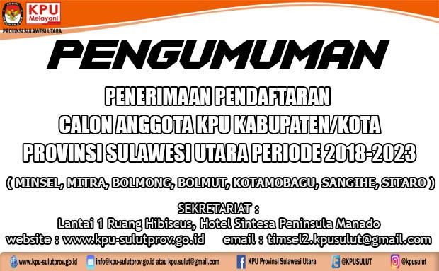 Manado, sulut.kpu.go.id - Tim Seleksi Tahap ll Calon Anggota Komisi Pemilihan Umum Kabupaten/Kota se Sulawesi Utara, mengundang untuk mendaftarkan diri menjadi Calon Anggota Komisi Pemilihan Umum Kabupaten/Kota Provinsi Sulawesi Utara Periode 2018 - 2023 di 7 Kabupaten/Kota yang terdiri dari : Kabupaten Minahasa Tenggara, Kabupaten Minahasa Selatan, Kabupaten Bolaang Mongondow, Kabupaten Bolaang Mongondow Utara, Kota Kotamobagu, Kabupaten Kepulauan Sangihe dan Kabupaten Kepulauan Sitaro. Adapun Dokumen Persyaratan yang dimasukkan yaitu : Surat pendaftaran ditandatangani di atas materai Rp. 6.000,00 (enam ribu rupiah) (MODEL SP. CALON 1); Fotokopi Kartu Tanda Penduduk Elektonik atau Surat Keterangan yang diterbitkan oleh Dinas Kependudukan dan Catatan Sipil; Pas Foto Berwarna Terbaru 6 (enam) bulan terakhir ukuran 4 x 6 cm (empat kali enam sentimeter sebanyak 6 (enam) lembar; Daftar Riwayat Hidup (MODEL DRH. CALON 6); Fotokopi ljazah Pendidikan terakhir yang disahkan/dilegalisir oleh pejabat yang berwenang; Makalah terstruktur yang menguraikan pengetahuan dan/atau keahlian berkaitan dengan penyelenggara Pemilu, kompetensi dan integritas (MODEL PP. CALON 5) Surat pernyataan (MODEL SP. CALON 2): Surat keterangan dari pengurus partai politik bahwa yang bersangkutan tidak lagi menjadi anggota partai politik dalam jangka waktu 5 (lima) tahun terakhir, dalam hal calon anggota KPU Kabupaten/Kota pernah menjadi anggota partai politik (MODEL SK. CALON 3); Surat Pernyataan Tidak Pernah Menjadi Anggota partai politik (MODEL SP. CALON) Surat keterangan tidak pernah dipidana penjara berdasarkan putusan pengadilan yang telah memperoleh kekuatan hukum tetap karena melakukan tindak pidani yang diancam dengan pidana penjara 5 (lima) tahun atau lebih yang dikeluarkan oleh pengadilan negeri; dan Surat rekomendasi dari Pejabat pembina Kepegawaian bagi pegawai negeri sipil yang akan mengikuti seleksi. Melampirkan Fotocopy Sertifikat Piagam Tanda penghargaan. Formulir Kelengkapan Persyaratan Administrasi calon Anggota Komisi pemilihan Umum Kabupaten/Kota Provinsi Sulawesi utara periode 2013- 2023 dapat diperoleh di Sekretariat Tim Seleksi yang bertempat di Lantai I Ruang Hibiscus Hotel Sintesa Peninsula atau dapat diunduh pada website KPU Provinsi Sulawesi Utara. FILE DOWNLOAD : PENGUMUMAN PENERIMAAN PENDAFTARAN JADWAL DAN TAHAPAN SELEKSI LAMPIRAN PERATURAN KOMISI PEMILIHAN UMUM NOMOR 7 TAHUN 2018 TENTANG SELEKSI CALON ANGGOTA KOMISI PEMILIHAN UMUM PROVINSI DAN KOMISI PEMILIHAN UMUM KABUPATEN/KOTA. MODEL SP.CALON 1 SURAT PENDAFTARAN SEBAGAI CALON ANGGOTA KPU PROVINSI/KIP ACEH/KPU/KIP KABUPATEN/KOTA download MODEL SP.CALON 2 SURAT PERNYATAAN CALON ANGGOTA KPU PROVINSI/KIP ACEH / KPU/KIP KABUPATEN/KOTA download MODEL SK.CALON 3 SURAT KETERANGAN DARI PENGURUS PARTAI BAHWA YANG BERSANGKUTAN TIDAK LAGI MENJADI ANGGOTA PARTAI POLITIK DALAM JANGKA WAKTU 5 (LIMA) TAHUN TERAKHIR download MODEL SP.CALON 4 SURAT PERNYATAAN TIDAK PERNAH MENJADI ANGGOTA PARTAI POLITIK download MODEL PP.CALON 5 PEDOMAN PENYUSUNAN MAKALAH TERSTRUKTUR download MODEL DRH.CALON 6 DAFTAR RIWAYAT HIDUP CALON ANGGOTA KPU PROVINSI/KIP ACEH / KPU/KIP KABUPATEN/KOTA download