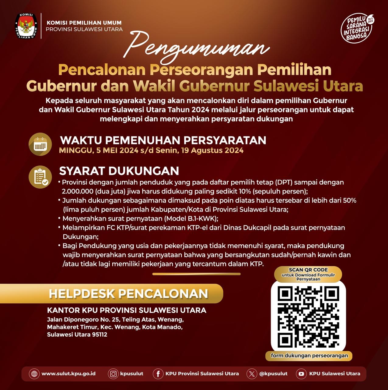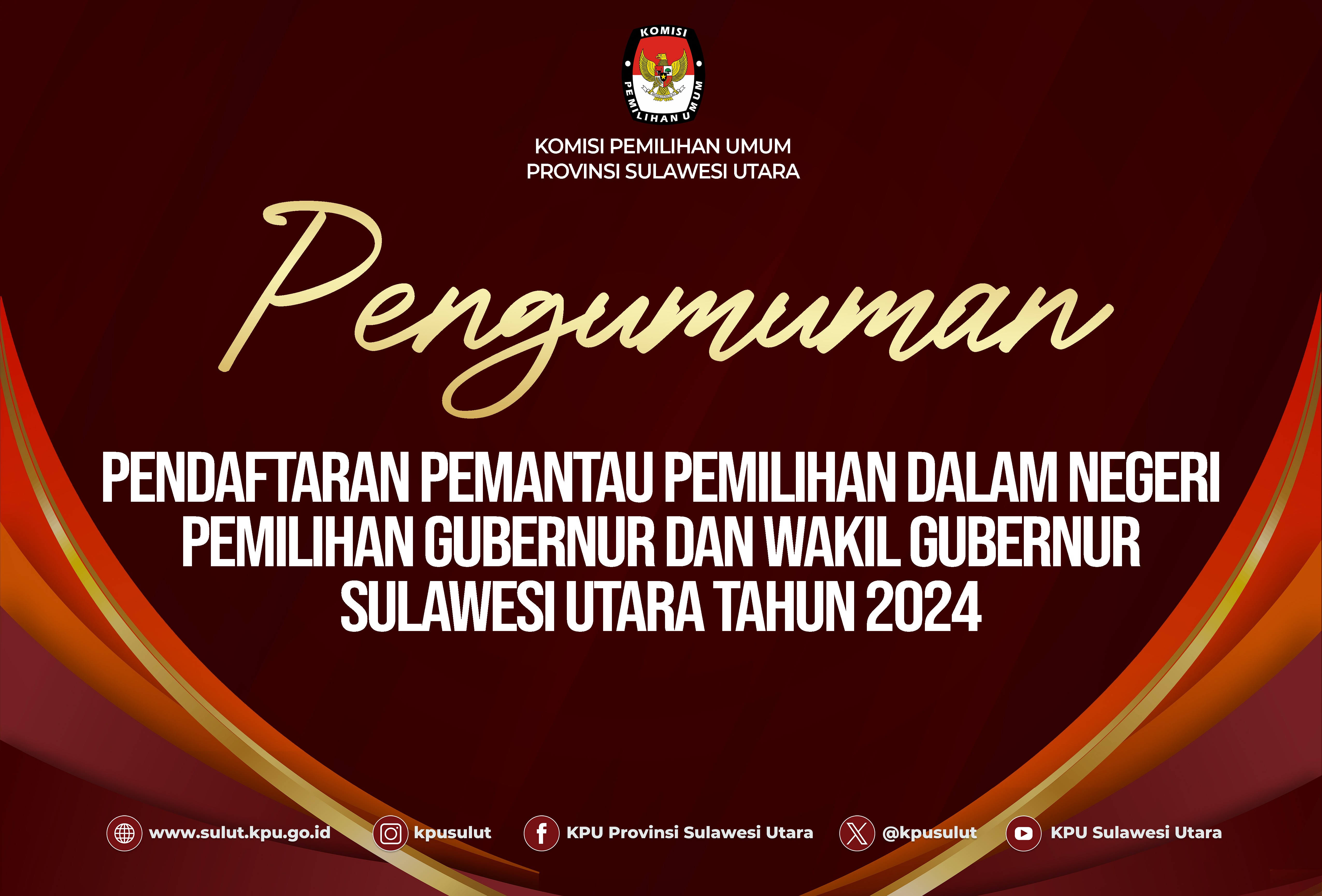 Dalam rangka melaksanakan Peraturan Komisi Pemilihan Umum Nomor 2 Tahun 2024 tentang Tahapan dan Jadwal Pemilihan Gubernur dan Wakil Gubernur, Bupati dan Wakil Bupati, serta Walikota dan Wakil Walikota Tahun 2024, Peraturan Komisi Pemilihan Umum Nomor 9 Tahun 2022 tentang Partisipasi Masyarakat Dalam Pemilihan Umum dan Pemilihan Gubernur dan Wakil Gubernur, Bupati dan Wakil Bupati, dan/atau Walikota dan Wakil Walikota, Keputusan Komisi Pemilihan Umum Provinsi Sulawesi Utara Nomor: 26 Tahun 2024 tentang Pedoman Teknis Pelaksaan Tahapan, Program dan Jadwal Penyelenggaraan Pemilihan Gubernur dan Wakil Gubernur Provinsi Sulawesi Utara Tahun 2024 serta Keputusan Komisi Pemilihan Umum Provinsi Sulawesi Utara Nomor: 29 Tahun 2024 tentang Pedoman Teknis Pendaftaran Pemantau Dan Pemantauan Pemilihan Gubernur dan Wakil Gubernur Provinsi Sulawesi Utara Tahun 2024, maka Komisi Pemilihan Umum Provinsi Sulawesi Utara mengumumkan pendaftaran Pemantau Pemilihan Dalam Negeri Pemilihan Gubernur dan Wakil Gubernur Provinsi Sulawesi Utara Tahun 2024 harus memenuhi ketentuan sebagai berikut: